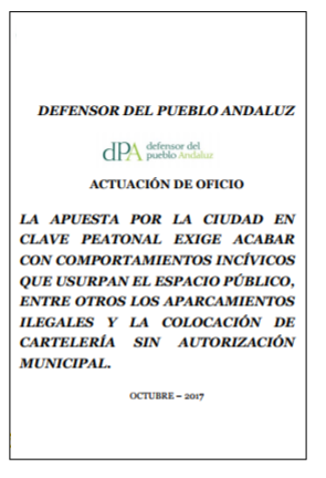 En la actuación de oficio 15/1813 "Ocupación del espacio público peatonal en detrimento de las personas" el Defensor del Pueblo Andaluz ha valorado las respuestas recibidas y con sus conclusiones ha redactado un documento que ha remitido a todos los Ayuntamientos de Andalucía.