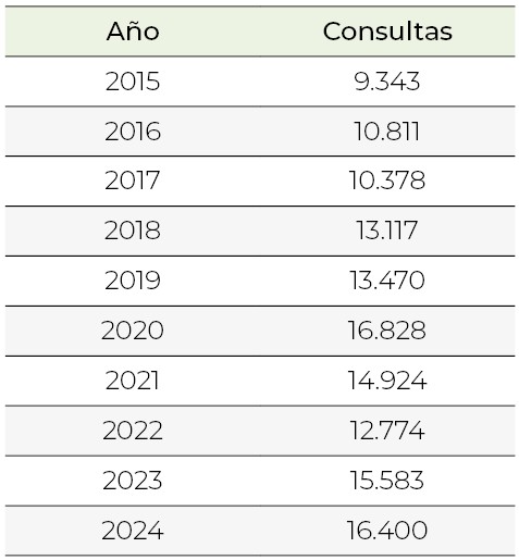 Durante el año 2024 hemos atendido un total de 16.400 consultas, habiéndose incrementado en un 5,2% con respecto al año anterior.