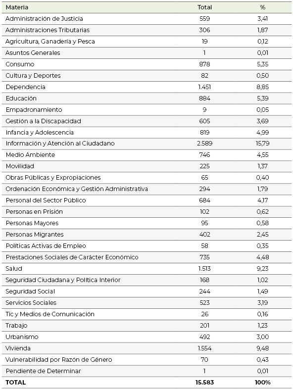 Con respecto a materias concretas, tal como se observa en la siguiente tabla, el grueso de consultas tiene relación con los servicios y prestaciones sociales: vivienda; infancia y adolescencia; salud y dependencia; consumo, personal de las administraciones públicas y seguridad social.