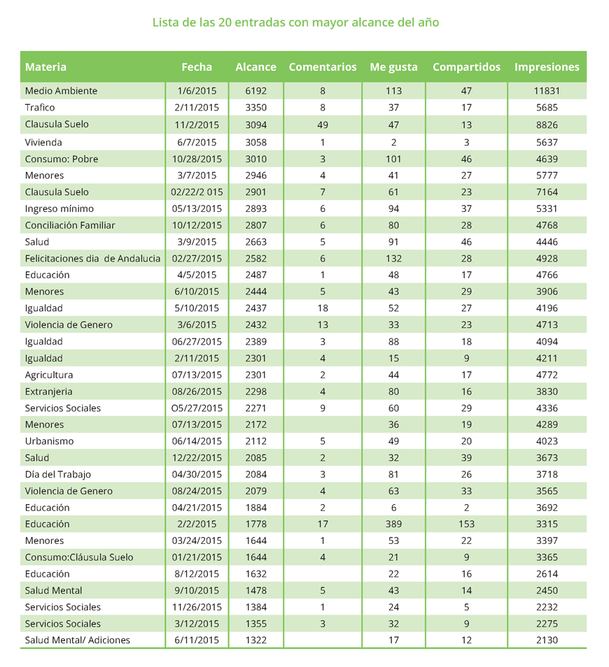 A continuación se analiza de manera más detallada la evolución habida a lo largo del año 2015 en cada una de las redes sociales en la que la Institución tiene presencia. Asimismo, se incorpora un apartado dedicado al análisis del sitio web del Defensor del Pueblo Andaluz.