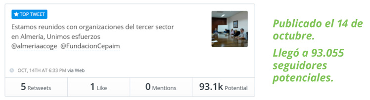 Por lo que afecta al alcance de nuestros mensajes, cabe señalar que a la fecha indicada han sido recibidos 1.710 retuits, 2.096 menciones y que hemos sido señalados como favoritos 732 veces.