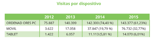 Siguen subiendo cada año las visitas realizadas a través de dispositivos móviles (teléfonos móvil o tablet), lo que supone, en el caso de los dispositivos móviles un incremento del 102%. Esta progresión fue el motivo para crear junto a la nueva web la adaptación a móviles de nuestra página.