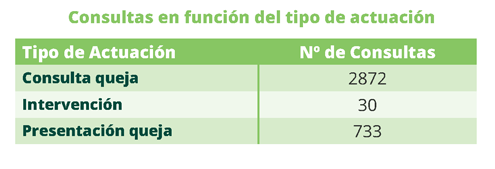 En este apartado se insertan los casos en los que la actuación llevada a cabo por parte de la Oficina de Información se orienta a la presentación de una queja ante esta Defensoría; y los casos en los que, sin necesidad de que medie dicha queja, el personal de la Oficina de Información realiza actuaciones ante organismos y entidades públicas o privadas, tendentes a solventar de manera ágil alguna necesidad específica que presente la persona que haya demandado nuestra intervención.