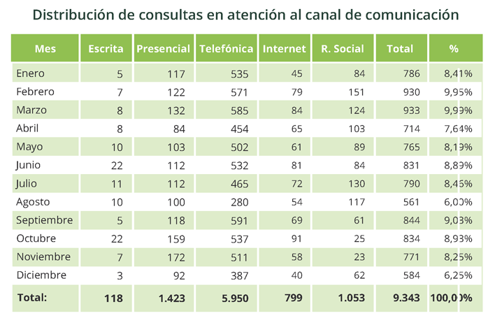 Como se observa en el cuadro que se contiene a continuación, febrero, marzo, junio, septiembre y octubre han sido los meses en los que se han recibido más consultas mientras que agosto y diciembre se posicionan como los meses con menor número de solicitudes de información, coincidiendo por tanto con los períodos en los que muchos ciudadanos y ciudadanas concentran sus vacaciones.