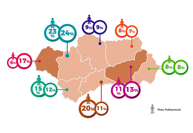 En políticas territoriales, son significativas, en relación a su peso poblacional, las provincias de Huelva y Granada.