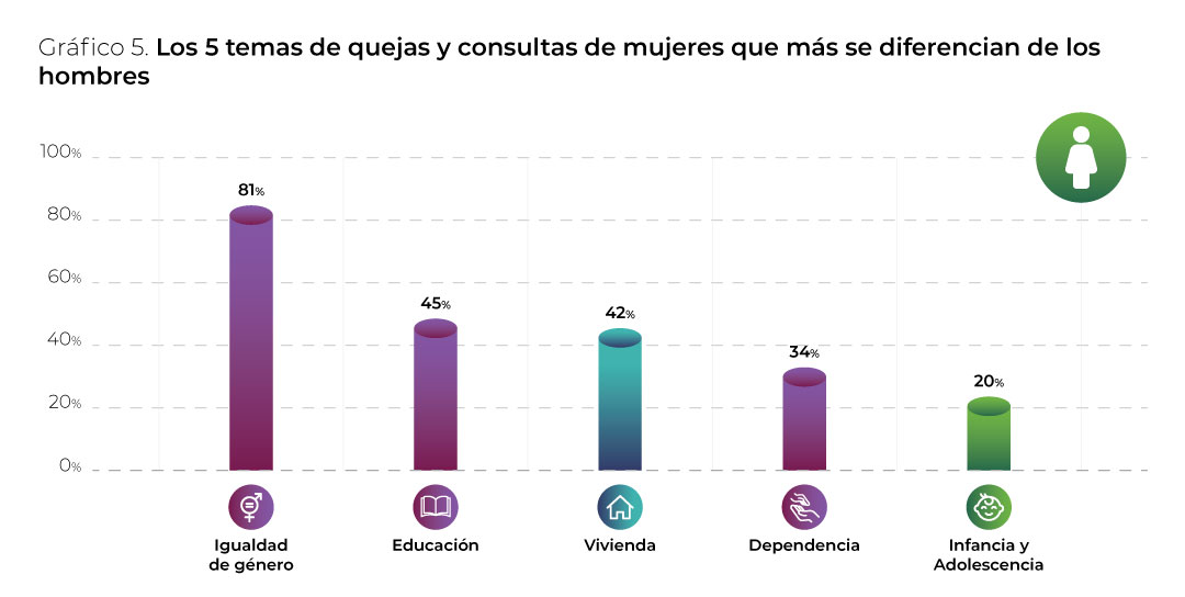 Además, los asuntos sobre los que los hombres más nos reclaman una actuación a diferencia de las mujeres son las políticas activas de empleo, cultura y deportes, y prisiones, mientras en los asuntos relacionados con igualdad de género, educación y vivienda se encuentran las mayores diferencias a favor de las mujeres.