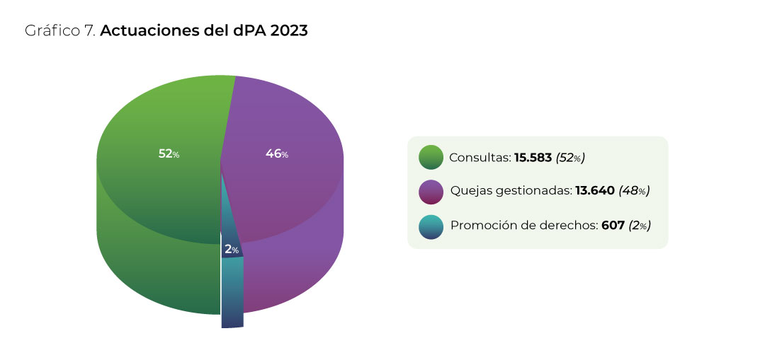 La actividad del dPA durante 2023 ha supuesto un total de 29.830 actuaciones; 13.640 quejas gestionadas (de parte, de oficio, mediaciones); 15.583 consultas; y 607 de promoción de derechos (jornadas, guías, reuniones, foros, actividades institucionales, etcétera).