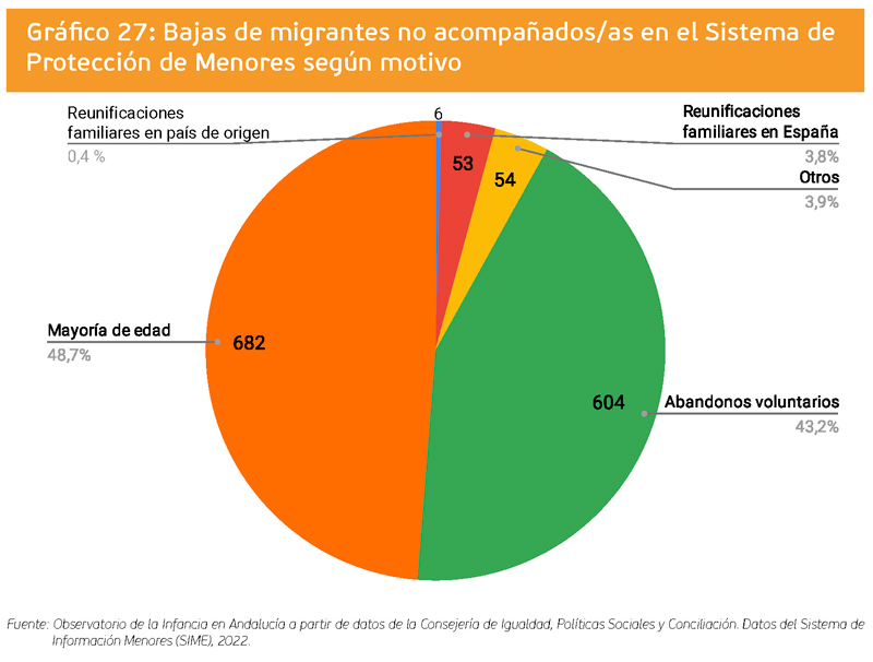 El 48,7% de las bajas del Sistema de Protección de Menores andaluz en 2021 se asocian al cumplimiento de los 18 años de edad, esto motiva el 48,9% de las bajas de los chicos y el 46,9% de las bajas de las chicas. Las bajas por abandono voluntario son el 43,2% de las bajas de migrantes en el Sistema de Protección de Andalucía, los abandonos voluntarios suponen el 45,4% de las bajas de chicos y solo el 6,2% de las bajas de chicas. Las bajas por reunificación familiar en España son el 6,1% del total de bajas, estas suponen el 3,9% de las bajas de niños y el 40,7% de las bajas de niñas. Por ultimo, a lo largo de 2021 se llevan a cabo desde Andalucía 6 reunificaciones familiares en el país de origen de 2 niñas y 4 niños migrantes no acompañados.