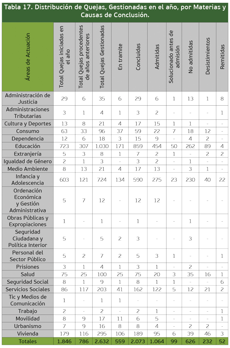 El relato pormenorizado de la actividad de la Defensoría a partir de las quejas tramitadas y de las consultas recibidas se plasma en el capítulo 3, para continuar el capítulo 4 describiendo la actividad institucional en su propósito de acercamiento a la ciudadanía, con especial relevancia a niños, niñas y jóvenes.