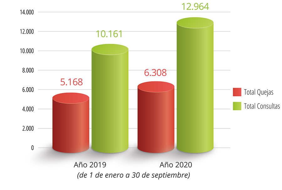 Destaca el incremento porcentual en ambos parámetros. Las quejas recibidas crecen un 22,30% (de 5.158 quejas a 6.308) y las consultas recibidas crecen un 27,59% (de 10.161 consultas a 12.964 consultas).