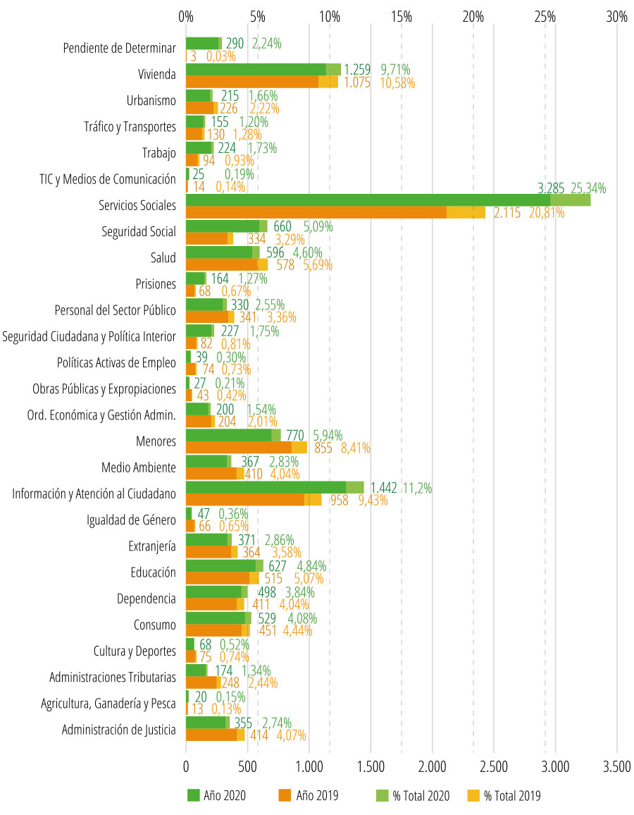 De las 12.964 consultas recibidas en el período, 3.474 (el 26,80%) tienen la materia transversal COVID-19. Es la materia de servicios sociales la que acapara el mayor número de consultas (1.633, el 47,01%). Destacan también las 280 consultas (el 8,06%) sobre educación, las 235 (6,76%) sobre seguridad social, y las 227 consultas (el 6,53%) sobre vivienda.
