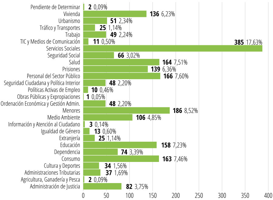 Además de servicios sociales se han recibido un gran número de consultas con materia transversal COVID-19 de vivienda (184, el 7,39%) y de seguridad social (157, el 6,30%). Sin embargo las materias con una mayor proporción de consultas con materia transversal COVID-19 son seguridad ciudadana y política interior, con 99 consultas de 116, el 85,34% (debidas a las dudas surgidas con respecto a las medidas de restricción de movilidad y régimen sancionador), trabajo con 100 de 134 consultas, el 74,63% (debidas a las consultas sobre el régimen de los ERTES) y la ya citada servicios sociales.