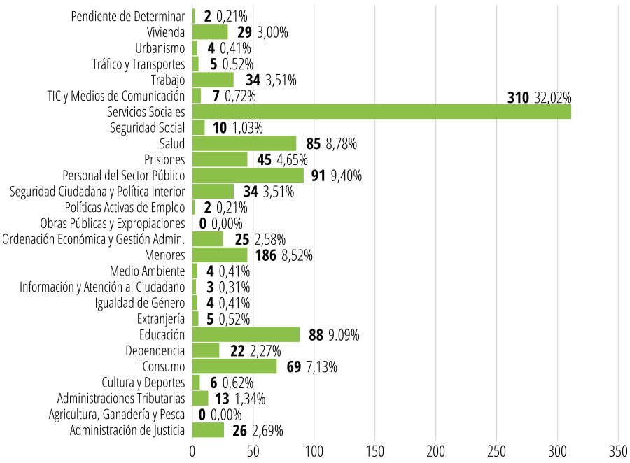 Las materias con un número significativo de consultas (más de 100) en las que el porcentaje de las mismas presentadas por mujeres es superior al 60% son las siguientes: dependencia (61,99%), menores (61,03%), servicios sociales (68,23%) y vivienda (65,98%).
