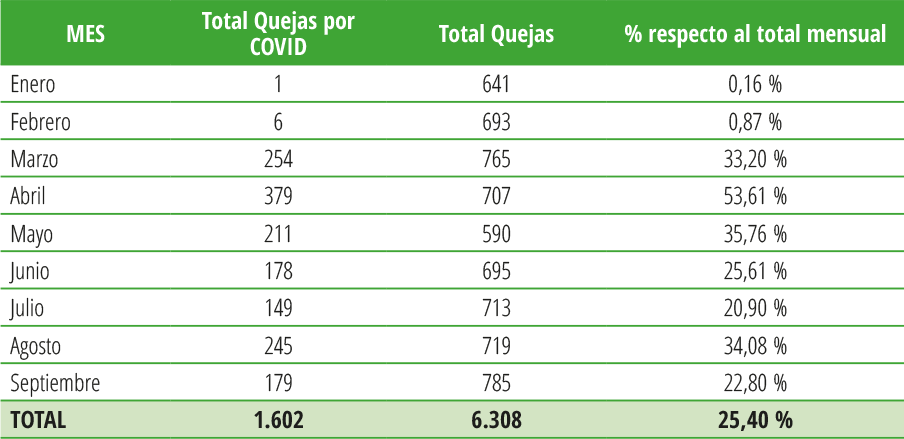 1.1.20. Distribución mensual de quejas en el período del 01/01/20 al 30/09/20 y porcentaje de éstas clasificadas con la materia COVID-19.