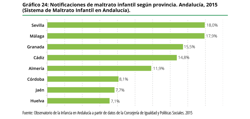 Durante el año 2015, se han registrado 2.084 notificaciones de maltrato infantil, siendo las provincias de Sevilla (18%), Málaga (17,9%) y Granada (15,5%) las que han notificado un mayor número de casos. Los principales ámbitos de notificación fueron Servicios Sociales (86,8%) y Servicios Educativos (5,7%). La negligencia (41,1%) y el maltrato emocional (34,5%) son las principales tipologías de maltrato notificadas.
