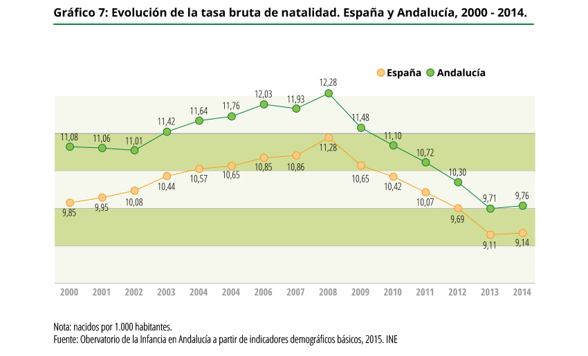 Siguiendo la tendencia de los países desarrollados, la tasa bruta de natalidad mantiene una evolución descendente continuada en los últimos años. En el periodo 2000-2014 se ha registrado un descenso del 11,9% de la tasa bruta de natalidad. Hay dos momentos evolutivos reseñables, por un lado, el comprendido entre el año 2000 y 2008 en el que se observa un incremento de la misma llegando a situarse en 12,28 nacimientos por cada 1.000 habitantes, siendo el valor más elevado de este periodo, y por otro, el comprendido entre 2008 y 2014 con un descenso de 2,52 puntos.