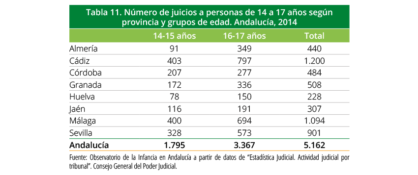 En Andalucía, en 2014 las estadísticas judiciales consultadas registran un total de 5.162 juicios a personas entre 14 y 17 años, lo que supone un descenso del 9% respecto al año anterior (en 2013 se registraron 5.675 juicios). Del total de jóvenes juzgados, un 65,2% tenían entre 16 y 17 años, un 34,8% entre los 14-15 años.
